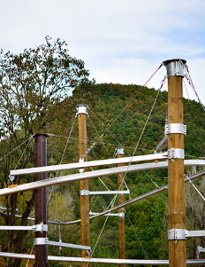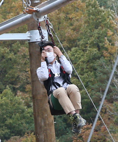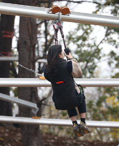 무릉별유천지의 소나무 숲에 설치된 총길이 300m의 곡선형 집라인 놀이기구