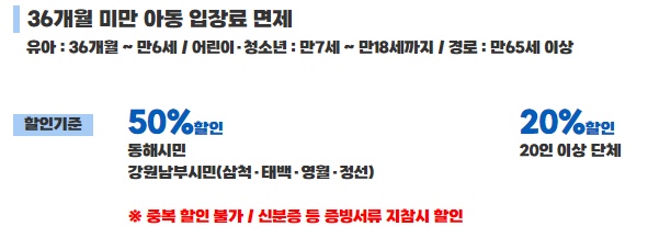 무릉별유천지 라벤더 축제 입장료는 6월에서 9월까지는 성수기 요금이 적용됩니다. 36개월 미만의 아동의 경우 입장료가 무료이며 동해시민이거나 삼척, 태백, 영월, 정선 시민이라면 50% 할인을 받을 수 있고 20인 이상 단체일 경우에도 20% 할인을 받을 수 있습니다. 단, 무릉별유천지 50% 할인의 경우 신분증과 같이 증빙서류를 지참해야 할인을 받을 수 있습니다.