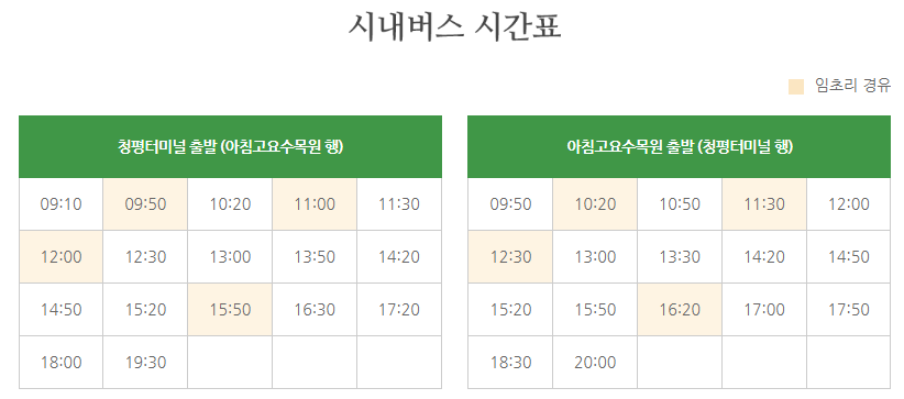 버스는 터미널(동서울, 지방터미널 등) 또는 청량리 환승센터 1번에서 출발하여 청평터미널에서 내리면 됩니다.