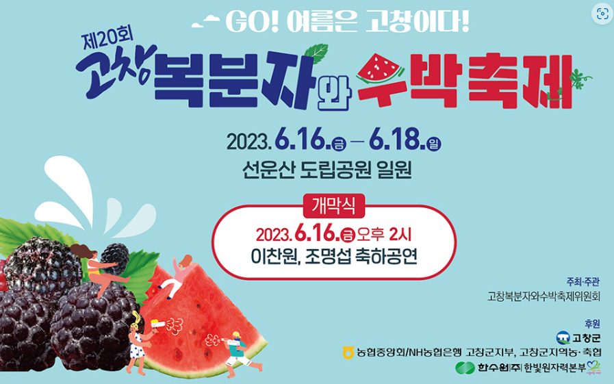 고창에서 복분자와 수박을 주제로 축제가 열립니다. 이번 축제에는 개막식 및 축하공연으로 이찬원과 조명섭이 예정되어 있습니다. 그럼 지금부터 행사일정, 축제 프로그램, 가는 길 등 고창 복분자와 수박 축제에 대해서 자세히 알아보도록 하겠습니다.