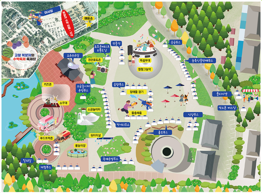 또한 고창 복분자와 수박 축제에는 다양한 부스들이 마련되어 있습니다. 식당부스, 홍보부스, 먹거리부스, 물놀이장, 워터터널, 푸드트럭존, 체험부스, 물총싸움, 소금놀이터 등 다양한 부스들과 체험장이 마련되어 있기 때문에 각 각의 장소는 아래 사진을 통해 쉽게 확인하실 수 있습니다.
