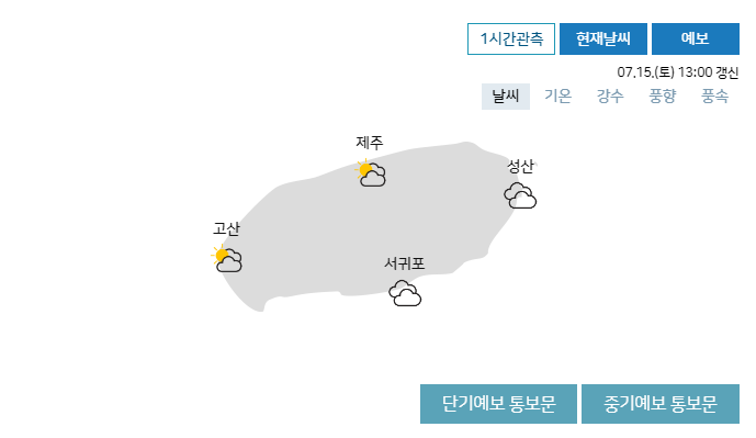 제주지방기상청을 방문하면 오늘, 내일, 모레, 글피(3일 뒤), 중기(일주일) 제주도 날씨를 확인할 수 있습니다. 날씨와 기온, 강수량, 강수확률, 바람, 습도, 폭염영향 등을 자세히 확인할 수 있으며, 대기질 정보인 초미세먼지, 미세먼지, 오존의 상황까지도 한 번에 확인할 수 있습니다. 또한, 지역 검색을 통해서 내가 방문하고자 하는 곳의 날씨를 확인할 수도 있습니다.