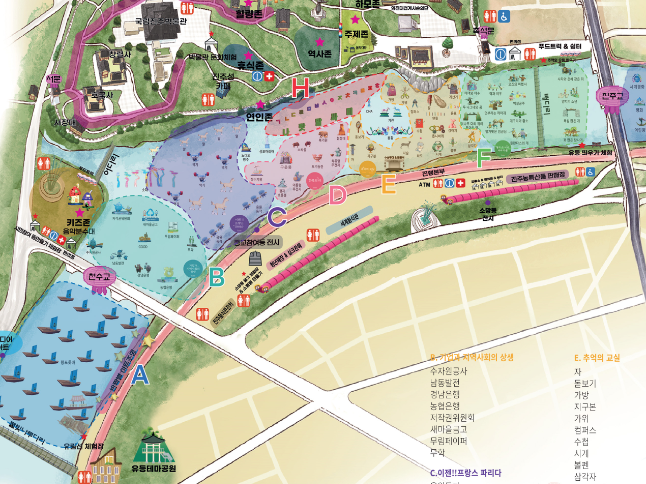2시간 코스: 망경동둔치 (천년광장아래)→배다리 (1부교)→촉석루→영남 포정사→진주성 포루→호국사→진주성 카페(휴식 & 드링크)→용다리전설 (3부교)→음악분수대→천수교 위→망경동둔치 (다양한 창작등과 체험행사)