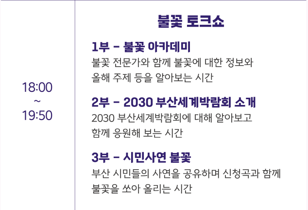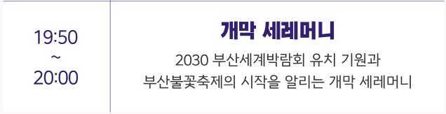 1부-불꽃 아카데미, 2부-2030 부산 세계박람회 소개, 3부-시민사연불꽃 - 19시 50분~20시 개막 세레머니