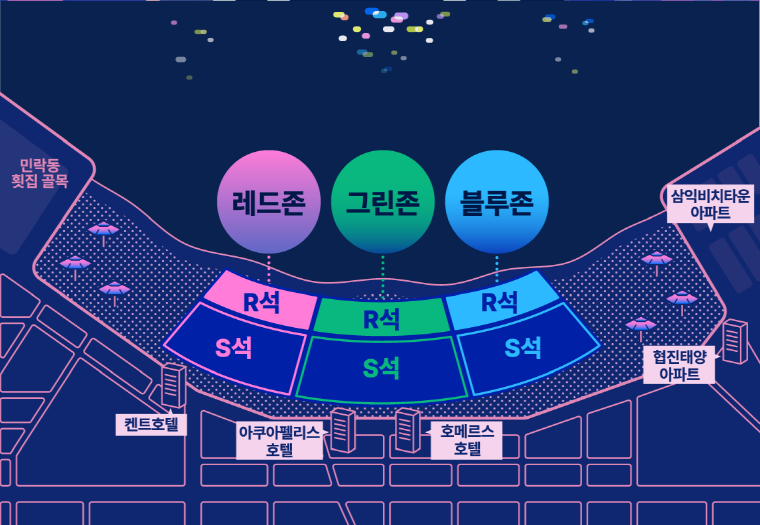 설명한 것과 같이 부산불꽃축제는 S석과 R석으로 나뉘어 있으며, R석의 가격이 더 비쌉니다. R석이 비싼 만큼 앞쪽에서 구경할 수 있으며 의자와 함께 테이블이 제공됩니다. S석의 경우에는 의자만 제공이 되며 R석에 비해 뒷자리에서 관람을 해야 한다는 점입니다. 부산불꽃축제 명당은 그린존 R석이라고 할 수 있겠습니다.