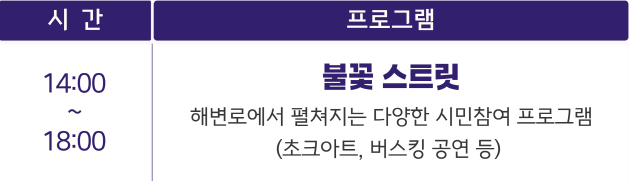 해변로에서 펼쳐지는 다양한 시민참여 프로그램(초크아트, 버스킹 등) - 18시~19시 불꽃 토크쇼