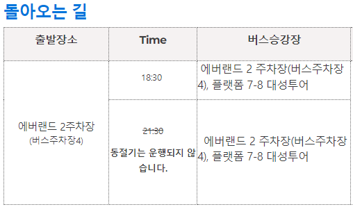 에버랜드를 이용 후 집으로 돌아올 때도 같은 버스를 탑승하면 되는데 에버랜드 셔틀버스 출발 시간은 18시 30분에 출발하니 그전에 탑승장소인 '에버랜드 2 주차장(버스주차장 4), 플랫폼 7-8 대성투어'에 도착하여 탑승하여야 합니다. 동절기에는 21시 30분 타임 셔틀버스는 운행하지 않으니 참고하시기 바랍니다.