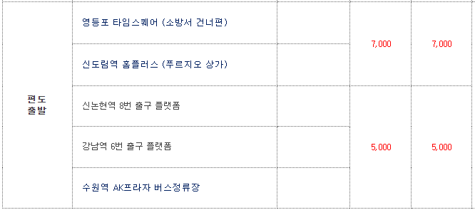 대성트레블을 이용할 경우 서울지역만 운행을 하고 있으며, 금액은 왕복 14,000원입니다. 탑승 시간은 탑승 장소에 따라 달라지니 아래 사진을 참고하시기 바랍니다.