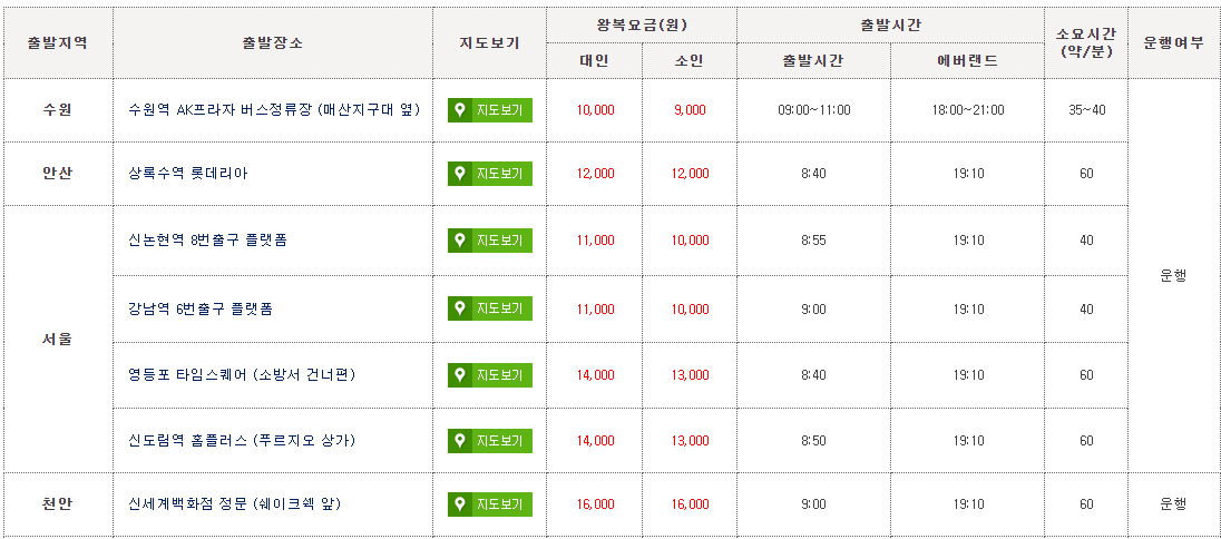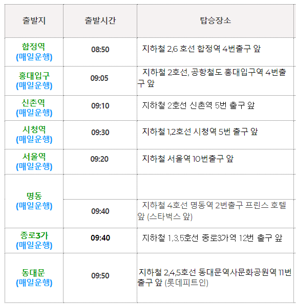 서울은 신논현역 8번 출구에서 8시 55분, 강남역 6번 출구에서 9시, 영등포 타임스퀘어(소방서 건너편)에서 8시 40분, 신도림역 홈플러스(푸르지오 상가)에서 8시 50분에 출발합니다.