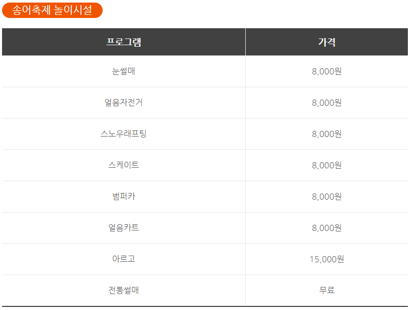 평창 송어축제에는 낚시 이외에도 놀이시설이 마련되어 있습니다. 눈썰매, 얼음자전거, 스노우래프팅, 스케이트, 범퍼카, 얼음카트, 아르고, 전통썰매가 있습니다. 사진을 클릭하면 큰 화면으로 확인할 수 있습니다. 평창 송어축제 눈썰매 8,000원, 얼음자전거 8,000원, 스노우래프팅 8,000원, 스케이트 8,000원, 범퍼카 8,000원, 얼음카트 8,000원, 아르고 15,000원, 전통썰매는 무료입니다.