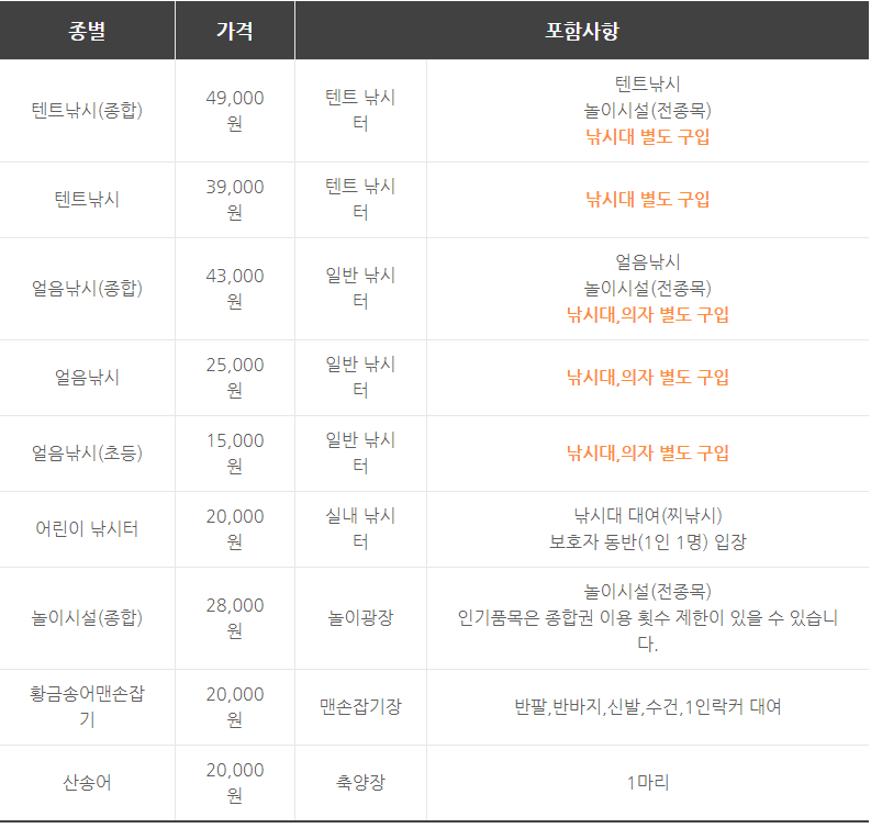 평창 송어축제 입장료는 텐트 낚시(종합) 49,000원, 텐트낚시 39,000원, 얼음낚시 43,000원, 얼음낚시 25,000원, 얼음낚시(초등) 15,000원, 어린이 낚시터 20,000원, 놀이시설(종합) 28,000원, 황금송어맨손 잡기 20,000원, 산송어 20,000원입니다. 위에서 언급한 것과 같이 텐트 낚시를 이용하려면 반드시 온라인 예약으로만 가능하다는 점 참고하시기 바랍니다.