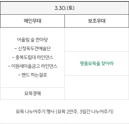 옥천묘목축제는 일정은 3월 29일부터 3월 31일까지이며 별도의 입장료는 없습니다. 자세한 행사 일정은 아래와 같습니다.