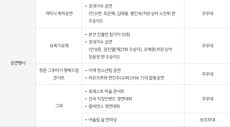 또한, 초대가수 공연(민수현, 최은혜, 김태웅, 황인숙[히든싱어 소찬휘 편 우승자], 안성훈, 권진열[제21회 우승자], 오예중[히든싱어 장윤정 편 우승자]) 등의 공연도 준비되어 있습니다.