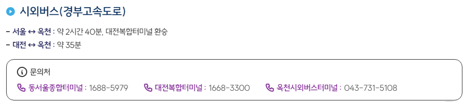 시외버스를 이용하여 옥천묘목축제에 방문하실 분들은 위 문의처에 문의해 보시는 걸 추천드립니다. 대충 서울지역에선 2시간 40분이 거닐며 대전복합터미널에서 환승하셔야 합니다.