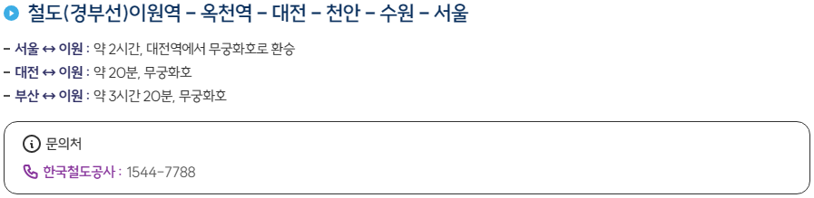 옥천묘목축제를 철도를 이용하여 방문할 경우에는 서울지역에서는 대전역에서 무궁화호로 환승해야 하며 2시간 정도 소요됩니다.