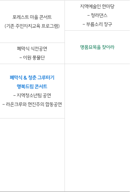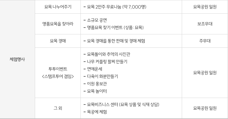 이외에도 행사장 일원에서 "이원면" 홍보 스탬프 투어(쌀 500g 증정), 묘목도리와 함께하는 추억의 사진관(무료), 나무 커플반지, 커플팔찌 만들기(무료), 연애 운세(2,000원), 이원면 홍보관(이원양조장 막걸리 무료시음), 묘목놀이터 및 보드게임(무료), 묘목 비즈니스 센터(묘목 상품 및 기술 상담), 다육이 화분 만들기(무료), 세계음식문화관 등을 즐길 수 있습니다.