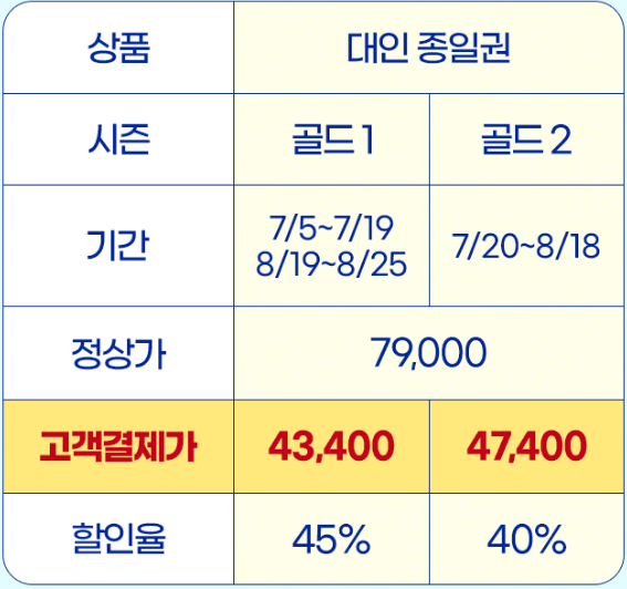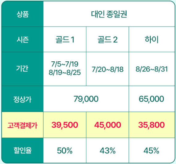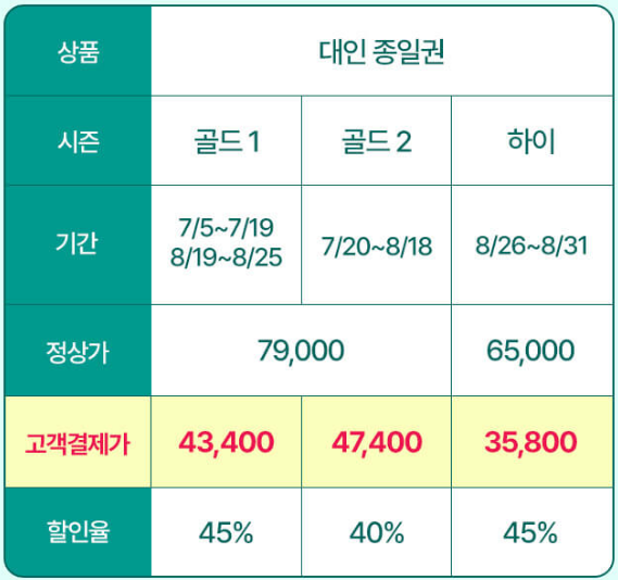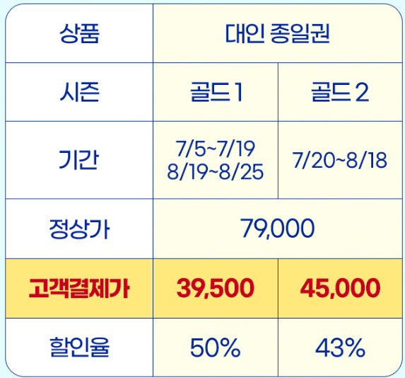 하나카드를 이용 중이라면 캐리비안베이 할인 50%를 받고 대인 종일권을 구매할 수 있는데 스마트예약을 통해서만 혜택을 받을 수 있고 만약 현장에서 결제를 한다면 최대 45%까지 할인을 받을 수 있습니다. 시즌에 따라 가격은 달라지지만 39,500원에서 47,400원으로 캐리비안베이를 즐길 수 있습니다.