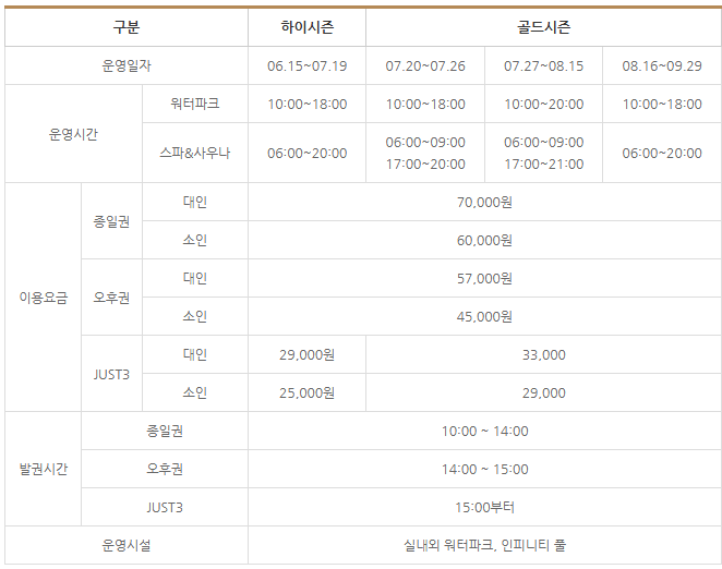 골드시즌의 경우 3구간으로 나뉘며 7월 20일부터 26일(골드시즌1), 7월 27일부터 8월 15일(골드시즌2), 8월 16일부터 9월 29일(골드시즌3)까지로 나뉘게 됩니다. 7월 27일부터 8월 15일(골드시즌2)에는 오전 10시부터 오후 8시까지 운영이 되며, 나머지 기간(골드시즌1, 3)에는 오전 10시부터 오후 6시까지 운영됩니다. 방문 전에 반드시 방문하는 날짜가 어디에 해당되고 운영시간이 어떻게 되는지 확인하시기 바랍니다.