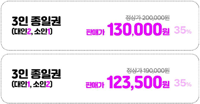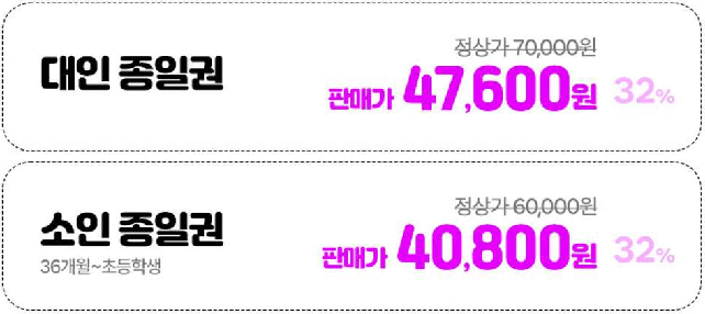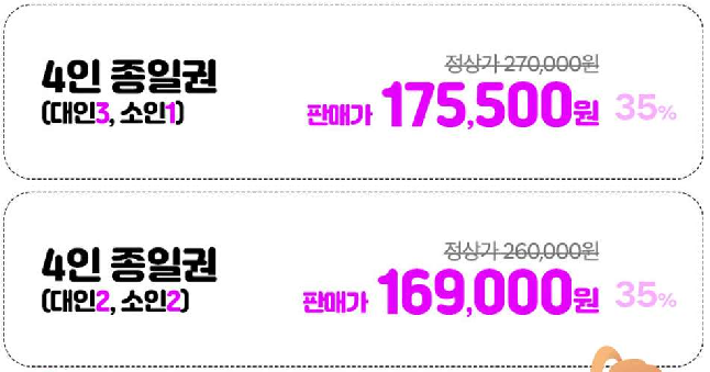 단순히 대인, 소인으로 예매를 할 수 있을 뿐 아니라 3인 종일권(대인 2, 소인 1 혹은 대인 1, 소인 2)과 4일 종일권(대인 2, 소인 2 혹은 대인 3, 소인 1)과 같이 다양한 선택지가 있고 뒤에서 설명할 제휴카드 할인율은 최대 30%이기 때문에 가족, 친구, 연인들과 방문할 계획이라면 해당 방법을 추천드립니다.