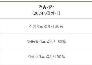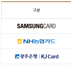 디오션 워터파크 할인카드는 삼성카드, NH농협카드, 광주은행 KJ카드를 이용하여 결제하면 본인 포함 최대 4인까지 30%의 할인을 받을 수 있습니다. 단, 제휴카드를 이용하여 할인을 받을 경우에는 타 할인 이벤트와 중복할인을 받을 수 없고 기프트카드 할인도 받을 수 없습니다.