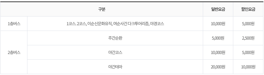 참고로 여수 낭만버스 요금의 경우 1층 버스는 일반요금 10,000원, 할인요금 5,000원입니다. 2층 버스의 경우 주간순환은 일반요금 5,000원, 할인요금 2,500원이며, 야간코스는 일반요금 10,000원, 할인요금 5,000원이고 야간테마의 경우에는 일반요금 20,000원, 할인요금 10,000원입니다.