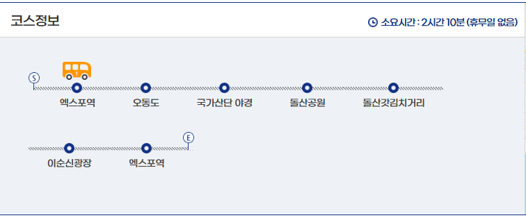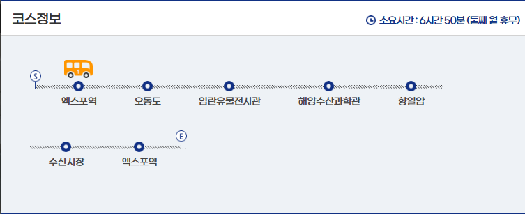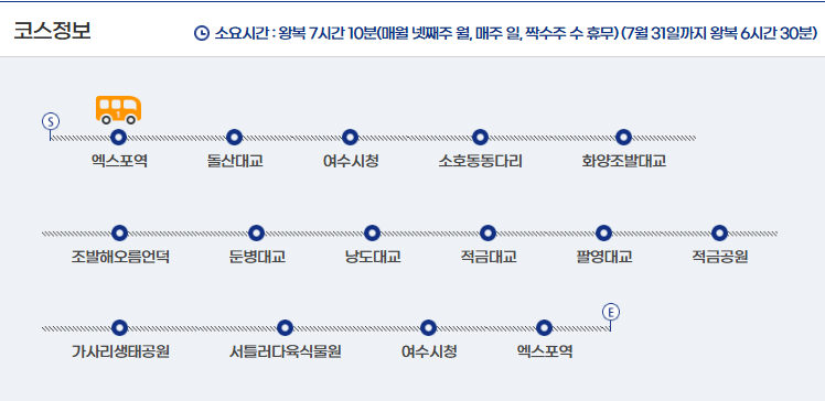 2코스는 총 7시간 10분으로 되어있지만 7월 31일까지는 6시간 30분으로 운영되는데 이유는 서틀러다육식물원이 12월 31일까지 휴관을 하기 때문입니다. 이외에 2코스는 월요일에서 토요일까지만 운행을 하며, 매월 넷째 주 월요일과 매주 일요일은 휴무입니다. 또한 탑승지가 2곳으로 여수 엑스포 혹은 여수시청에서 탑승하실 수 있습니다.