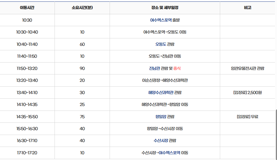 먼저 여수 낭만버스 1코스입니다. 엑스포역에서 출발해 오동도, 임란유물전시관, 해양수상과학관, 향일암, 수산시장을 돌아 엑스포역으로 되돌아오는 코스입니다. 참고로 진남관은 현재 복원공사(~2024년 말 예정) 중으로 관람이 불가하여 진남관 부속 임란유물전시관 관람으로 대체됩니다. 각 코스별 상세 일정은 아래와 같습니다.