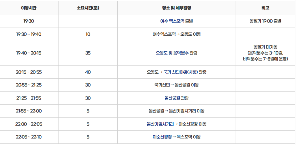 출발시간은 19시 30분에 여수 엑스포역에서 출발하고 동절기인 12월에서 2월의 출발시간은 19시입니다. 2층 버스는 휠체어 탑승 가능하고, 청각장애인을 위한 수화통역사를 배치하고 있으니 필요하다면 버스 예약 후 담당처에 연락하시면 됩니다.