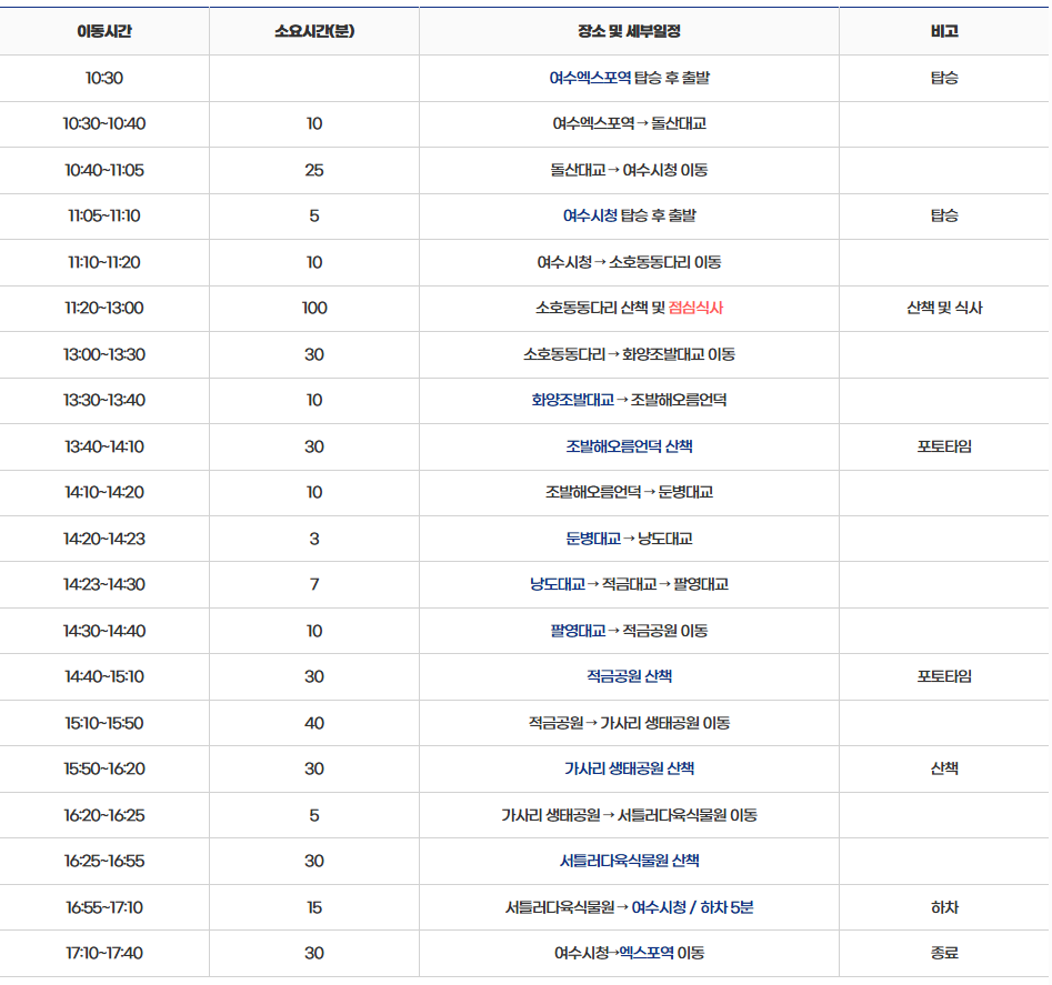 총 소요시간은 6시간 50분으로 예정되어 있습니다. 여수 낭만버스 1코스의 경우 매월 둘째 주 월요일은 휴무이며, 2층 버스를 이용할 경우에 휠체어도 탑승이 가능합니다. 또한 청각 장애인을 위한 수화통역사도 준비되어 있으니 필요하다면 버스 예약 후 담당처에 전화로 요청하시면 됩니다.