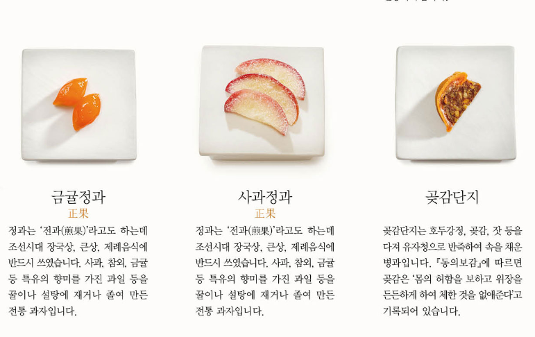 사과/금귤/참외정과는 ‘전과(煎果)’라고도 하는데 조선시대 장국상, 큰상, 제례음식에 반드시 쓰였습니다. 사과, 참외, 금귤 등 특유의 향미를 가진 과일 등을 꿀이나 설탕에 재거나 졸여 만든 전통 과자입니다.