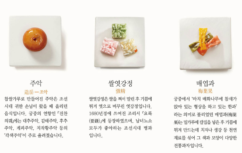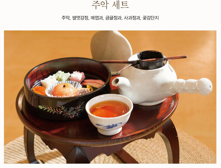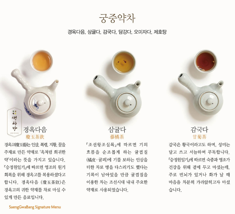 - 궁중약차: 경옥다음, 삼귤다, 감국다, 담강다, 오미자차, 제호탕